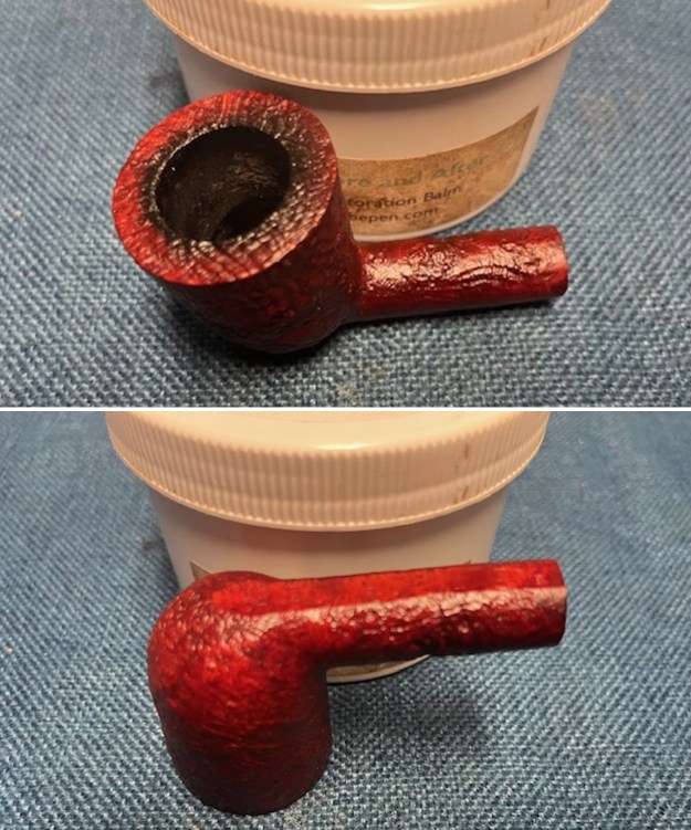 I scrubbed the bowl and shank with a tooth brush and some undiluted Murphy’s Oil Soap. I rinsed it off with warm water to remove the dust and soap from the finish. I dried it off with a soft cloth and it looked much better.