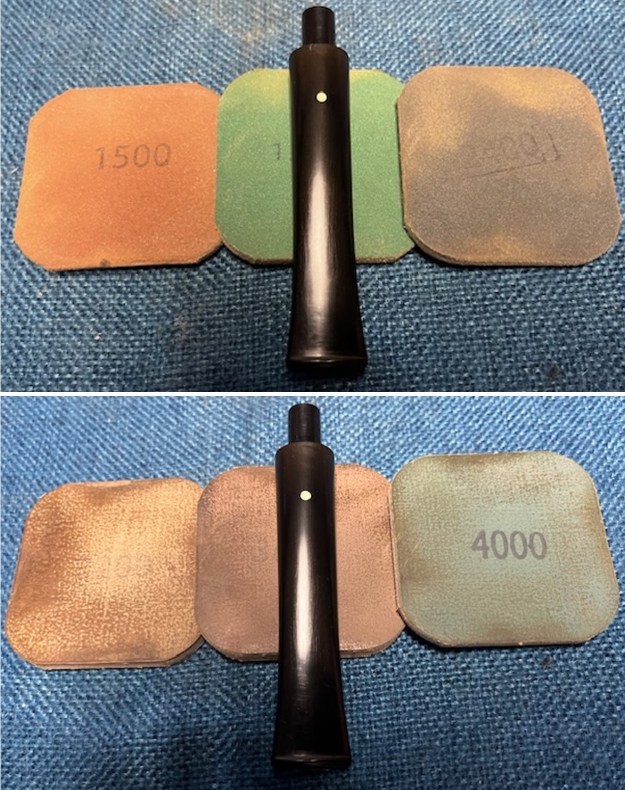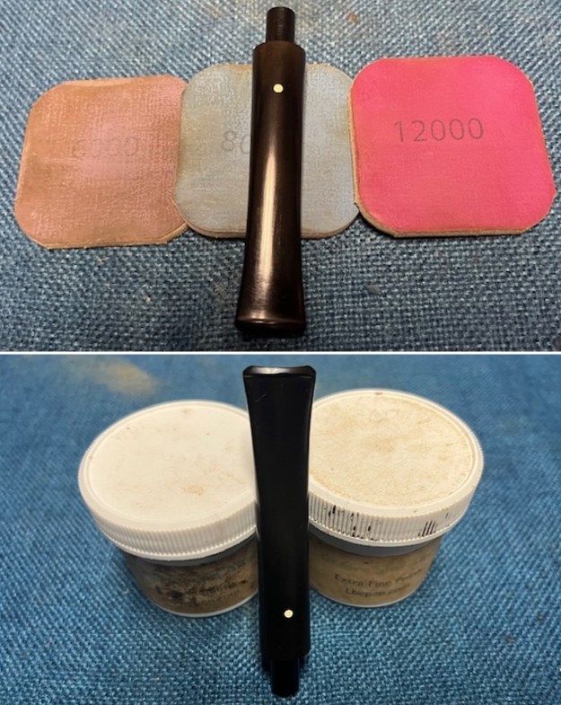 I polished the vulcanite with micromesh sanding pads – 1500-12000 grit pads. I wiped it down with Obsidian Oil after each sanding pad. I used Before & After Pipe Polish – both Fine and Extra Fine to further polish the stem.