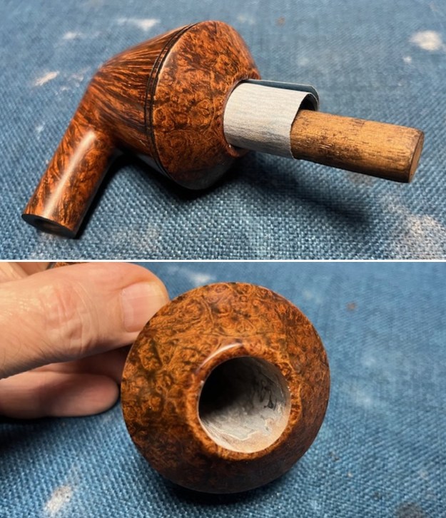 I turned to work on the pipe itself. I reamed the bowl with a PipNet pipe reamer using the cutting heads 2 and 3. I finished the reaming with a Savinelli Fitsall Pipe Knife. I sanded the walls of the bowl with 220 grit sandpaper wrapped around a piece of dowel.