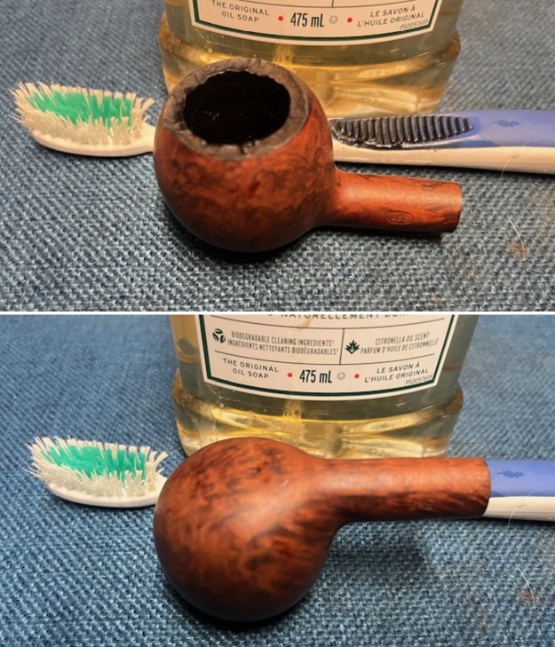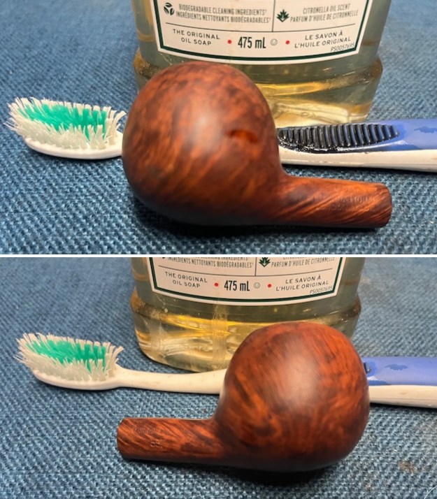 I scrubbed the bowl and shank with a tooth brush and some undiluted Murphy’s Oil Soap. I rinsed it off with warm water to remove the dust and soap from the finish. I dried it off with a soft cloth and it looked much better.