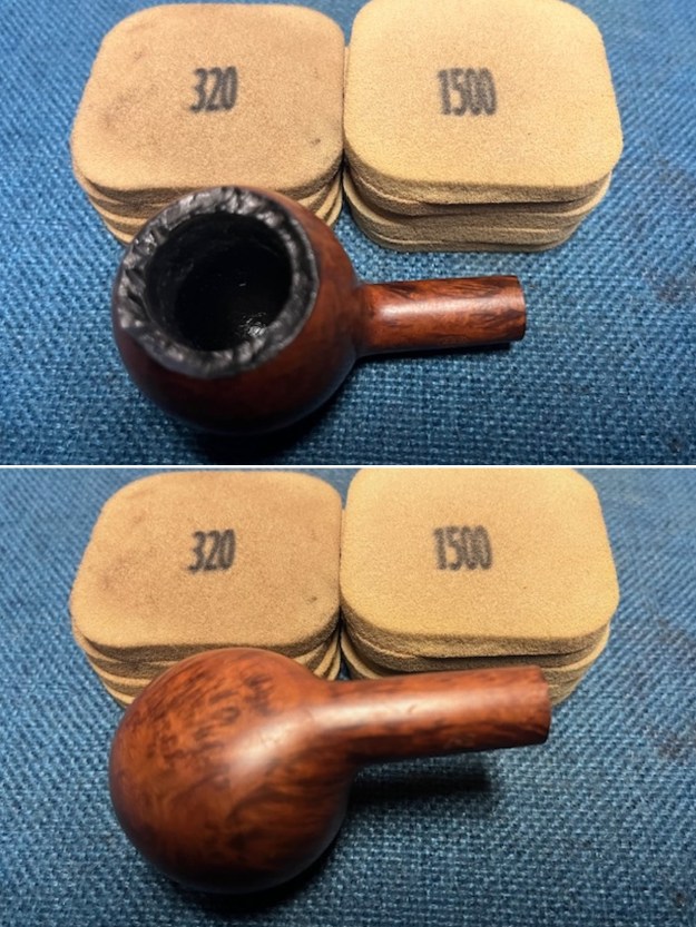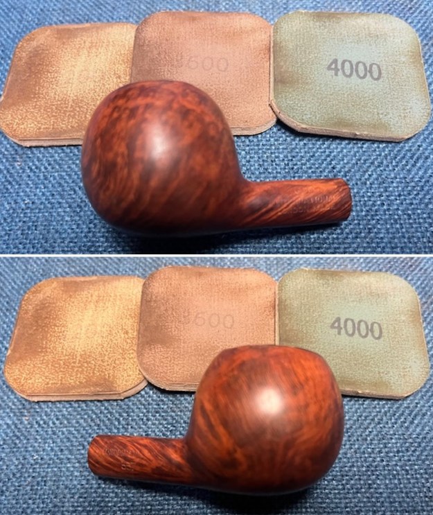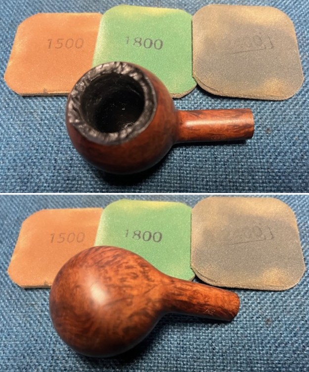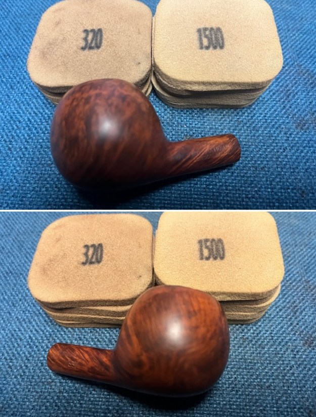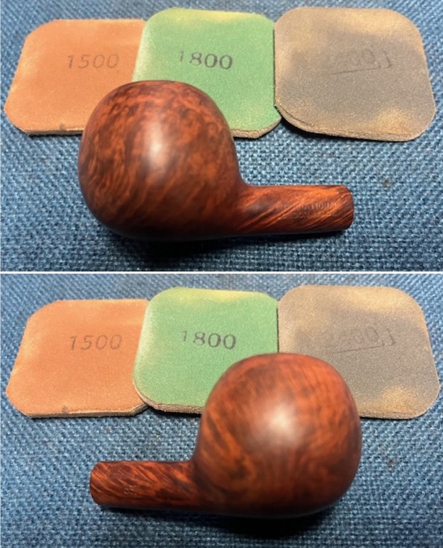 I sanded the bowl and shank with 320-3500 grit 2×2 inch sanding pads. I wiped the briar down with a damp cloth after each sanding pad to remove the sanding debris. It was beginning to look very good.