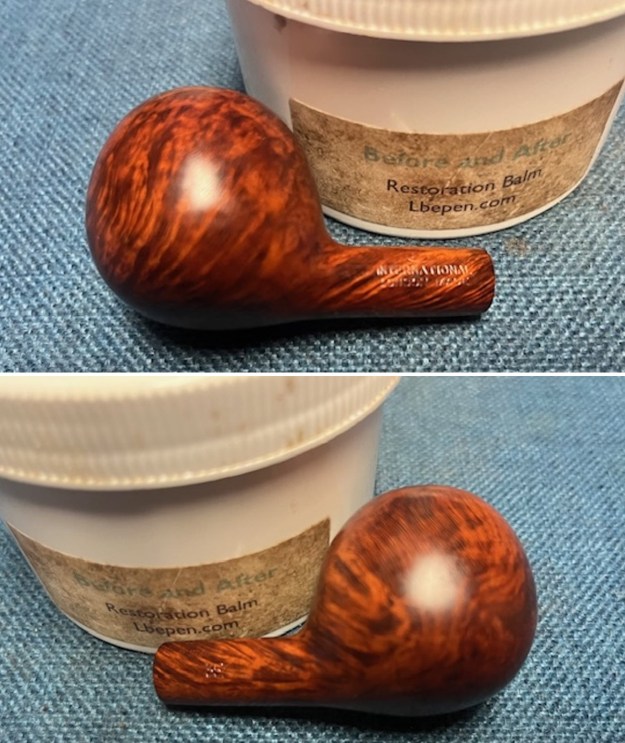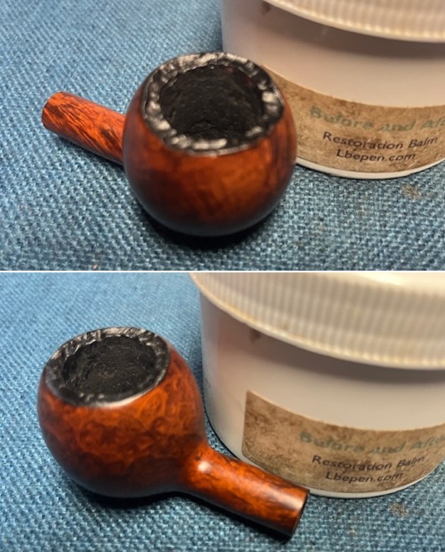 I rubbed the briar down with Before & After Restoration Balm. I worked it into the rusticated rim top and the smooth briar with my fingertips to work it into the finish. The product works to clean, enliven and preserve the briar. I let it sit for 10 minutes then I buffed it with a cotton cloth to deepen the shine. The briar really comes alive with the balm.