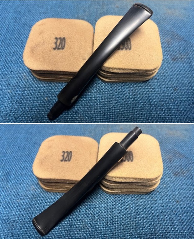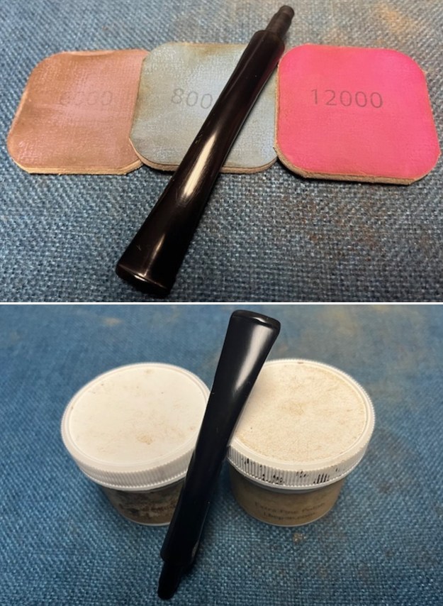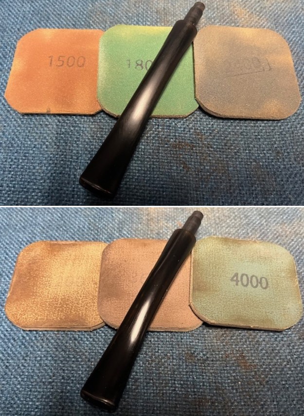 I polished the vulcanite with micromesh sanding pads – 1500-12000 grit pads. I wiped it down with Obsidian Oil after each sanding pad. I used Before & After Pipe Polish – both Fine and Extra Fine to further polish the stem.