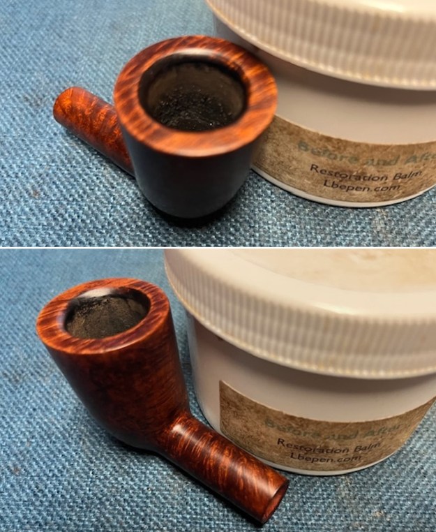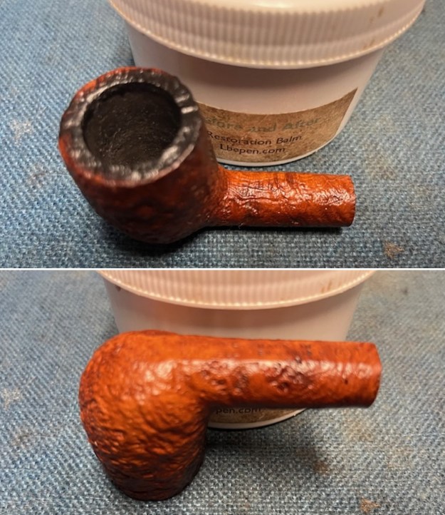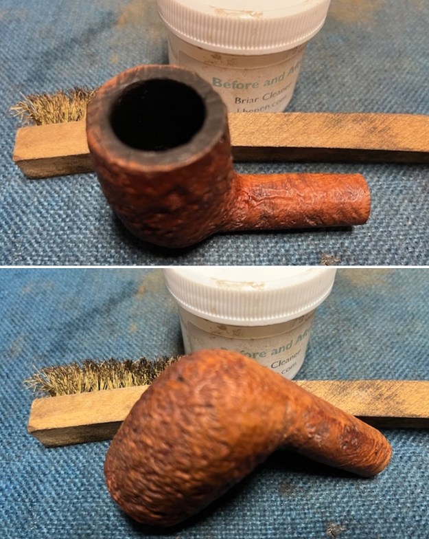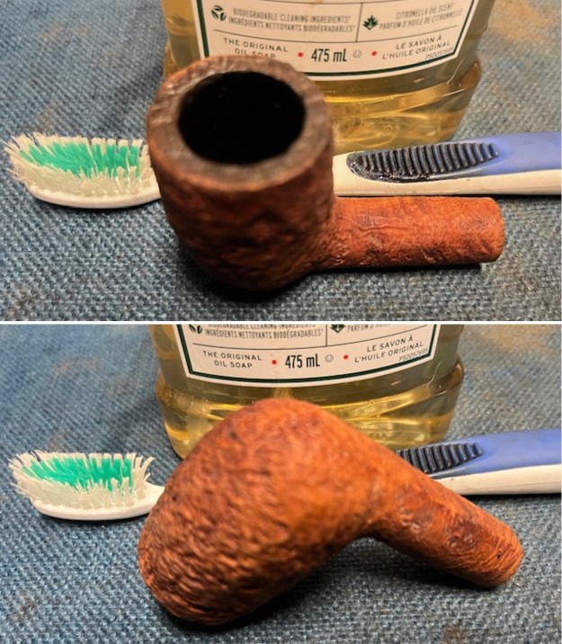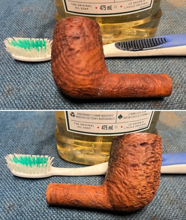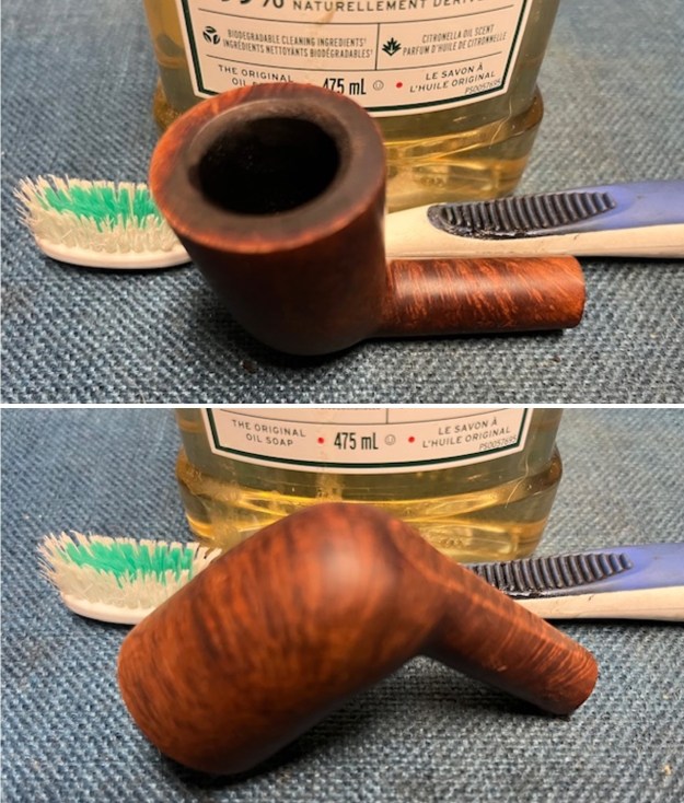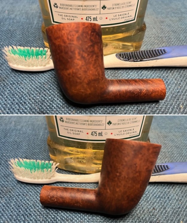 I scrubbed the bowl and shank with a tooth brush and some undiluted Murphy’s Oil Soap. I rinsed it off with warm water to remove the dust and soap from the finish. I dried it off with a soft cloth and it looked much better.