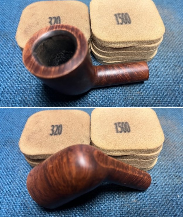 I sanded the bowl and shank with 320-3500 grit 2×2 inch sanding pads. I wiped the briar down with a damp cloth after each sanding pad to remove the sanding debris. It was beginning to look very good.