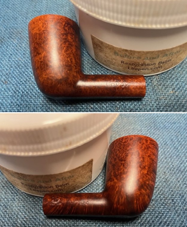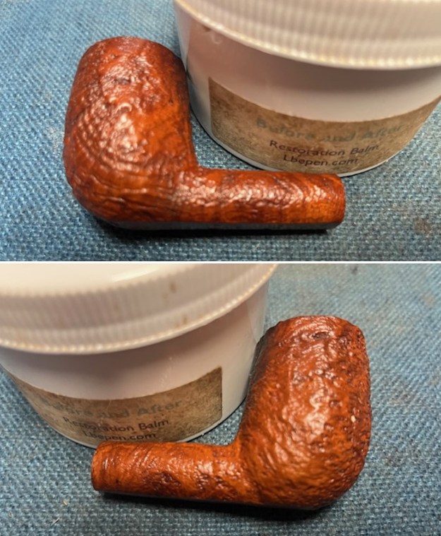 I rubbed the briar down with Before & After Restoration Balm. I worked it into the rusticated rim top and the smooth briar with my fingertips to work it into the finish. The product works to clean, enliven and preserve the briar. I let it sit for 10 minutes then I buffed it with a cotton cloth to deepen the shine. The briar really comes alive with the balm.