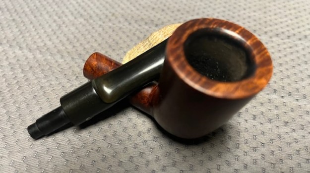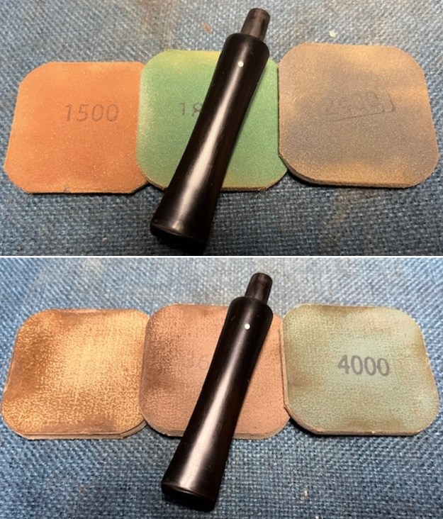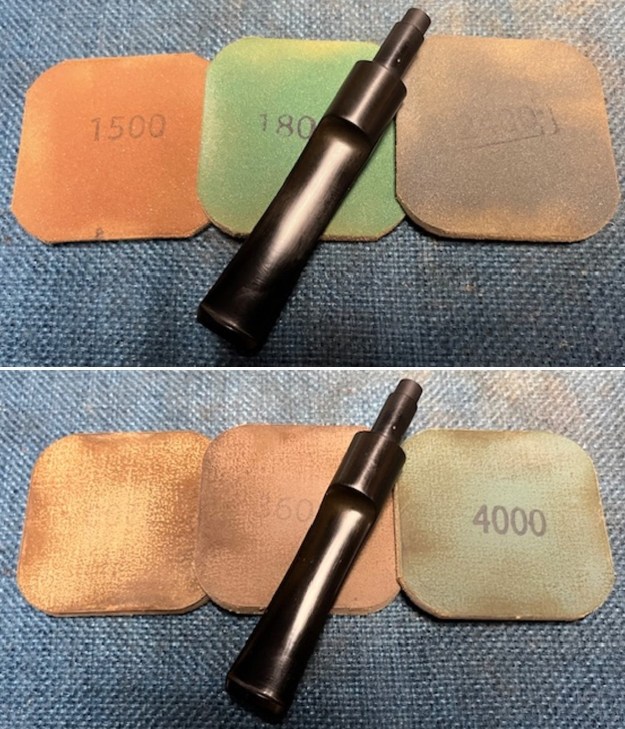 I polished the vulcanite with micromesh sanding pads – 1500-12000 grit pads. I wiped it down with Obsidian Oil after each sanding pad. I used Before & After Pipe Polish – both Fine and Extra Fine to further polish the stem.