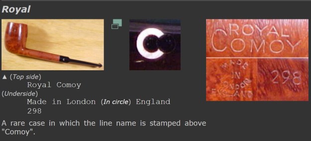 From there I turned to Pipephil’s site (http://www.pipephil.eu/logos/en/logo-comoy.html). I have included a screen capture of the listing for Royal Comoy that was there. It is interesting to me in that I have a second Royal Comoy that is the same shape number. I also have included the side bar information.