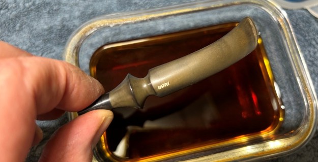 Once the stem was reasonably clean, I soaked it overnight in some Briarville Stem Oxidation Remover. This solution works to draw oxidation in the stem to the surface of the vulcanite. This is a major aid and an important step in ensuring a clean stem. The following day, I drew out the stem from its bath and scrubbed the lingering fluid with a toothbrush.