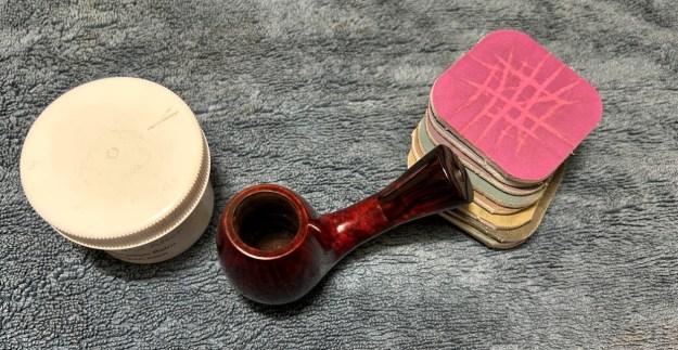 I then decided to ‘de-ghost’ the pipe – that is to say, exorcize the remaining filth from the briar. I filled the bowl and the shank with cotton balls, then saturated them with 99% isopropyl alcohol. I let the stummel sit overnight. This caused the remaining oils, tars and smells to leach out into the cotton.