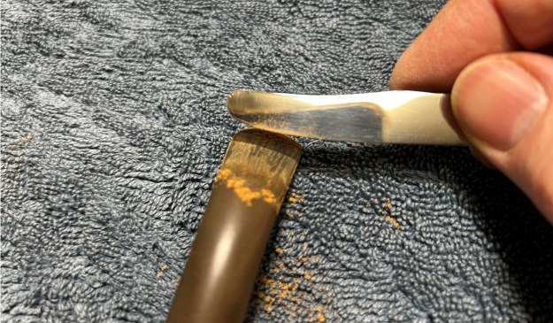 First things first. The stem’s calcification needed to be removed. I used an old butter knife and gently scraped some of the thicker accretion off. Doing this now helps later in removing the oxidation.