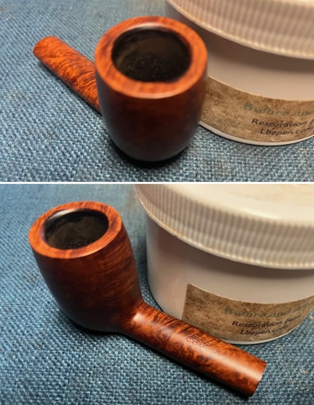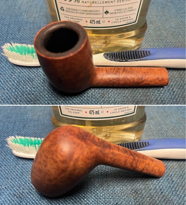 I scrubbed the bowl and shank with a tooth brush and some undiluted Murphy’s Oil Soap. I rinsed it off with warm water to remove the dust and soap from the finish. I dried it off with a soft cloth and it looked much better.