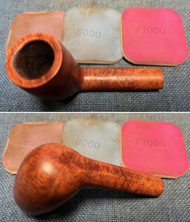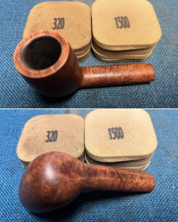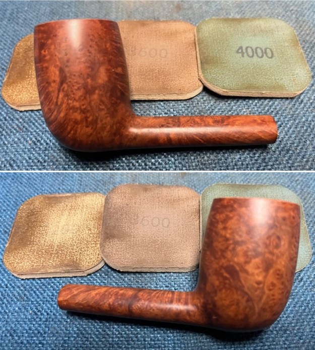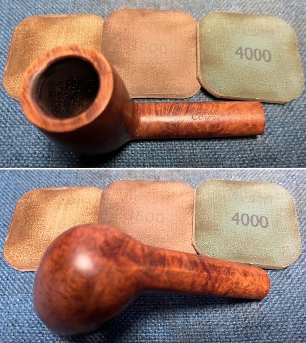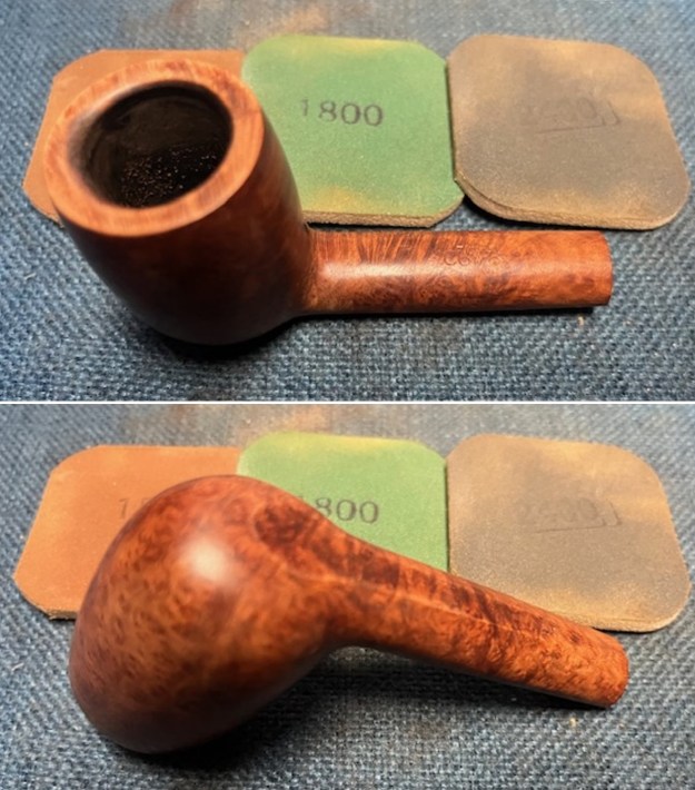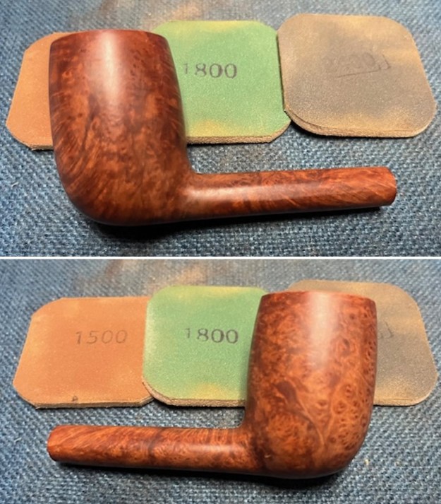 I sanded the bowl and shank with 320-3500 grit 2×2 inch sanding pads. I wiped the briar down with a damp cloth after each sanding pad to remove the sanding debris. It was beginning to look very good.