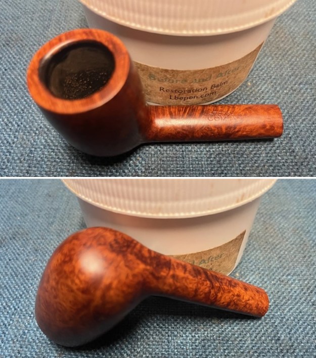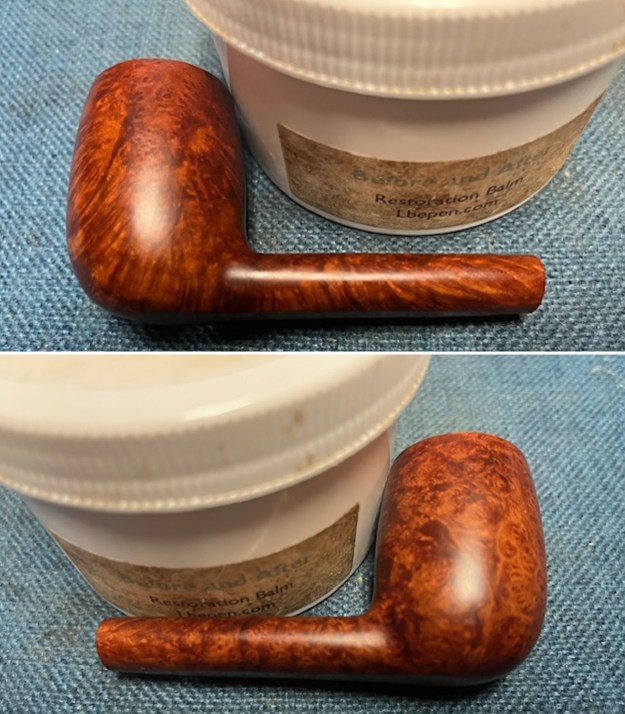I rubbed the briar down with Before & After Restoration Balm. I worked it into the rusticated rim top and the smooth briar with my fingertips to work it into the finish. The product works to clean, enliven and preserve the briar. I let it sit for 10 minutes then I buffed it with a cotton cloth to deepen the shine. The briar really comes alive with the balm.