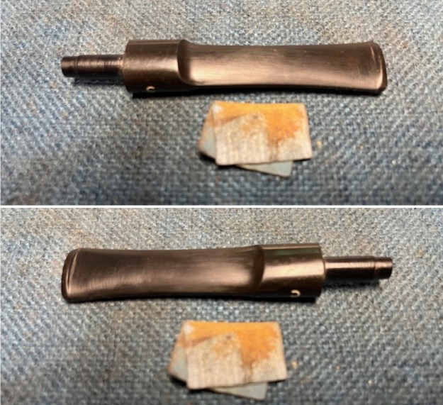I set the bowl aside and worked on the stem. I sanded the surface of the stem with a folded piece of 220 grit sandpaper to remove the oxidation and clean up the tooth marks and chatter on both sides of the stem ahead of the button.