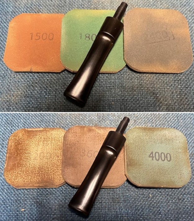 I polished the vulcanite with micromesh sanding pads – 1500-12000 grit pads. I wiped it down with Obsidian Oil after each sanding pad. I used Before & After Pipe Polish – both Fine and Extra Fine to further polish the stem.