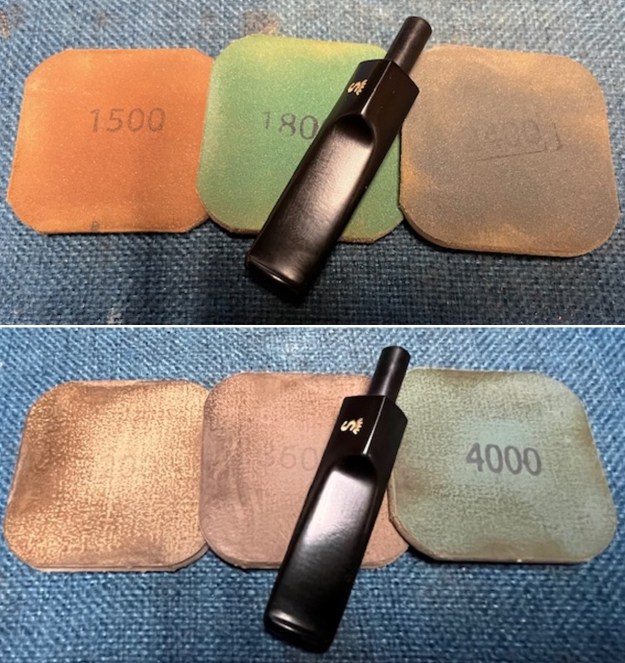 I set the bowl aside and turned my attention to the stem. I sanded the stem with 320-1500 grit sanding pads to further blend the sanding marks into the surface of the vulcanite. I wiped the stem down after each sanding pad with an Obsidian cloth to remove the debris from the sanding.