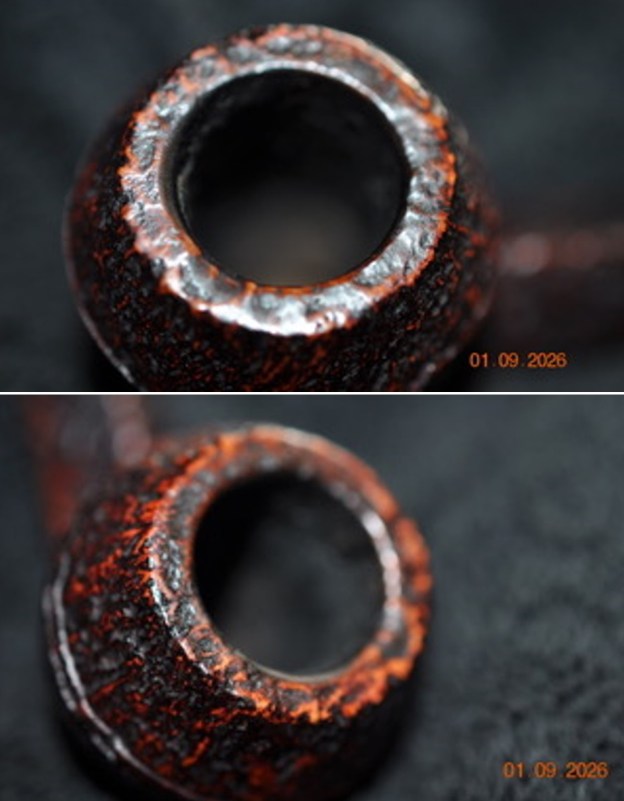 I took close up photos of both the rim top and the stem. Jeff had been able to get the grime and lava off of the rim top and it looked pretty incredible. Even the darkening and marks on the rim top on the right side and the back of the bowl look much better. The stem looked very clean. The tooth marks and chatter were minimal and should be easy to remove.