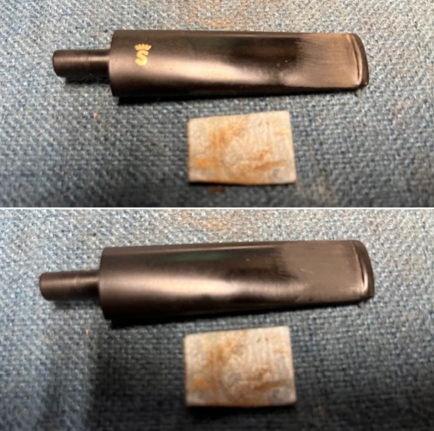 Jeff had cleaned up the pipe with his usual penchant for thoroughness. He reamed the pipe with a PipNet Pipe Reamer and cleaned up the remnants with a Savinelli Fitsall Pipe Knife.  He scrubbed the bowl with undiluted Murphy’s Oil Soap with a tooth brush. He rinsed it under running warm water to remove the soap and grime. He cleaned out the inside of the shank and the airway in the stem with alcohol, cotton swabs and pipe cleaners. He soaked the stem in Before & After Deoxidizer and rinsed it off with warm water. It came in Stanwell Box with Pipe Sock. I removed it from the sock and took photos of the pipe once I received it. I took close up photos of both the rim top and the stem. Jeff had been able to get the grime and lava off of the rim top and it looked pretty incredible. Even the darkening and marks on the rim top on the right side and the back of the bowl are very obvious now that it is clean. The stem looked very clean. The tooth marks and chatter were minimal and should be easy to remove.The stamping on the shank side was readable as noted above. I also took a photo with the stem removed to give an idea of the perspective and design of the pipe. I started my work on the pipe by addressing the damage on the inner edge of the bowl with a piece of 220 grit sandpaper and a sphere to remove the damage. I then used a half sphere to further shape the rim top to bring the edge back into round and it looked much better. Over all the rim top and edges looked much better.I sanded the outside of the bowl and rim with 320-3500 grit sanding pads to remove the scratching and marks on the briar. I wiped the bowl down between pads with a damp cloth to remove the sanding debris. I polished the smooth bowl and rim top with micromesh sanding pads using 1500-12000 grit sanding pads and wiping it down after each sanding pad with a damp cloth to remove the sanding dust and debris. I worked some Before & After Restoration Balm into the finish of the bowl and shank with my fingers. I want the product to go deep into the finish because it works to clean, enliven and protect the briar. Once I was confident that it was deeply worked into the finish I wiped it off and buffed it with a soft cloth to polish it. The pipe really began to have a rich shine. I took some photos of the bowl at this point to mark the progress in the restoration. The grain really stands out on the pipe in the photos below. I set the bowl aside and turned my attention to the vulcanite stem. I sanded the tooth marks and chatter with 220 grit sandpaper to smooth them out and blend them in. I wiped it down with an Obsidian cloth to remove the debris. I sanded the stem with 320-1500 grit sanding pads to further blend the sanding marks into the surface of the vulcanite. I wiped the stem down after each sanding pad with an Obsidian cloth to remove the debris from the sanding.I polished the vulcanite stem with micromesh sanding pads – wet sanding it with 1500-12000 grit pads. I wiped it down with Obsidian Oil after each sanding pad. I polished it with Before & After Pipe Polish – both the Fine and Extra Fine polishes. I gave it a final coat of oil and set it aside to dry. This Stanwell Made in Denmark Straight Grain 50 Oval Shank Billiard with a vulcanite taper stem is a great looking pipe now that it has been restored. The beautiful finish really highlights the straight grain and the polished finish is stunning. I put the stem back on the bowl and carefully buffed the pipe with Blue Diamond on the buffing wheel. I gave the bowl and the stem multiple coats of carnauba wax on the buffing wheel and followed that by buffing the entire pipe with a clean buffing pad. I hand buffed the pipe with a microfiber cloth to deepen the shine. The finished Stanwell Straight Grain 50 Billiard with an oval shank fits nicely in the hand and feels great. Give the finished pipe a look in the photos below. The dimensions of the pipe are Length: 5 ½ inches, Height: 1 ¾ inches, Outside diameter of the bowl: 1 ¼ inches, Chamber diameter: ¾ of an inch. The weight of the pipe is 48 grams /1.69 ounces. I will be adding the pipe to the Danish Pipe Makers Section of the rebornpipes store. If you are interested in purchasing this pipe send me a message or an email.