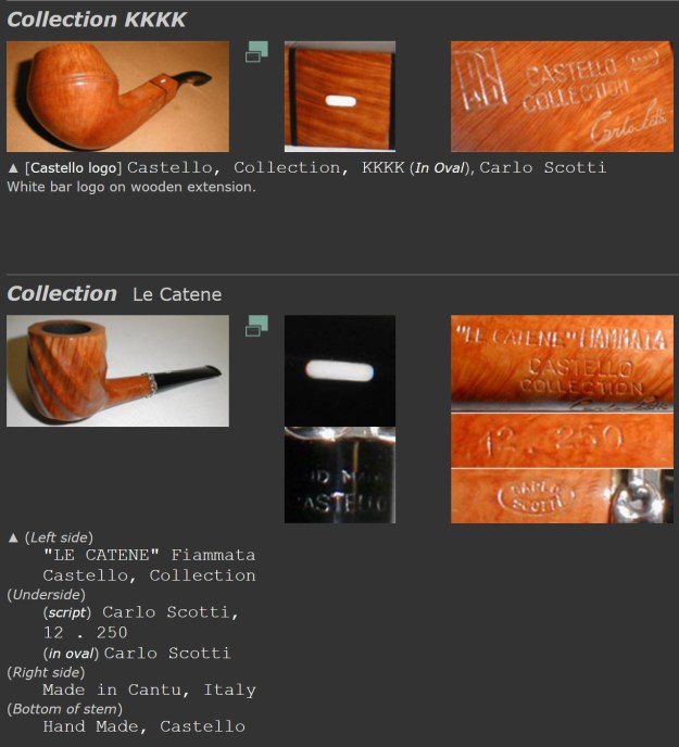 It is a beautiful chilly day in Vancouver without rain so I decided to go to the basement and work on another pipe that was purchased on 12/27/2025 in a lot of pipes that came to us from an estate of a pipeman in Durham, North Carolina, USA. The grain around the bowl and shank of this large Dubin has a mix of birdseye, straight and flame grain. The pipe is stamped on the topside of the shank and reads Castello [over] Collection [to the right] it has KK in an oval [over] the signature of Carlo Scotti. On the underside it is stamped with a Castello castle with the date stamp inside – 42 [followed by] Made in Catnu [over] Italy. To the right of it is stamped with an 11 [followed by] an oval with Carlo [over] Scotti on the inside of the oval. The pipe was dirty when Jeff received it. There was dust and grime ground into the finish. It is finished in the warm stain that highlights some nice grain around the bowl and shank. The bowl was heavily caked and there was some darkening and thick lava on the rim top. The inner edge is not visible under the lava so it may well be protected and undamaged. The acrylic taper stem was dirty with deep tooth marks and chatter on both sides ahead of the button and on the button itself. There was a white bar logo on the top of the stem. On the underside it is stamped Hand Made [over] Castello [over] 5. Jeff took photos of the pipe before he started his clean up work on it. Jeff took photos of the bowl and rim top to show what they looked like before the clean up. You can see the thick cake in the bowl and the darkening and lava on the inner edge and top of the rim. The photos of the sides and heel of the bowl show the grain around the bowl and shank. The stain adds depth finish on the pipe. Even under the grime it is a real beauty. The stamping on the sides of the shank are shown in the photos below. It is clear and readable as noted above. I wanted to get to the details of the Castello Collection so I turned to Pipephil’s site to see what I could learn about the line (http://www.pipephil.eu/logos/en/logo-castello.html). I did a screen capture of the pertinent information on the Collection line. There were several Collection pipe shown – a KKKK and Le Catene but no KK. The rest of the stamping shown in the photo below is identical to those.