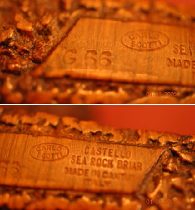 It is another rainy day in Vancouver and a day off so I decided to go to the basement and work on another pipe that was purchased on 12/27/2025 in a lot of pipes that came to us from an estate of a pipeman in Durham, North Carolina, USA. It included a group of Danish Made Stanwell pipes that are quite beautiful. The bowl and shank of this large Dublin has rich and heavily rusticated finish. The pipe is stamped on the left underside of the diamond shank on a smooth panel. It reads G66 [followed by] Carlo Scotti in and oval [followed by] Castello [over] Sea Rock Briar [over] Made in Cantu [over] Italy. The pipe was dirty when Jeff received it. There was dust and grime ground into the finish. It is finished in the warm stain that highlights some nice grain around the bowl and shank. The bowl was heavily caked and there was some thick lava on the rusticated rim top. The inner edge is not visible under the lava so it may well be protected and undamaged. The acrylic diamond taper stem was dirty with deep tooth marks and chatter on both sides ahead of the button and on the button itself. There was a diamond logo on the top left side of the stem. On the left underside it is stamped Hand Made [over] Castello. Jeff took photos of the pipe before he started his clean up work on it. He took some photos of the rim top and bowl from various angles to give me a clear picture of the condition of the rim top and bowl. The inside of the bowl is heavily caked with lava on the inner edge and in the sandblast on the rim top. He included photos that show the top and underside of the stem. It is as described above. Jeff took some photos of the sides and heel of the bowl to show the condition of the rusticated finish on the pipe. The photos showed some rugged rustication around the bowl and shank even with the grime in the finish. It is a great looking piece of briar. He took photos of the stamping on a smooth panel on the lower left side of the shank. It was clear and readable as noted above. As usual I cannot seem to retain the magnitude of details on Castello pipes in my head for long for some reason. The stamping on this one – Castello and the Carlo Scotti stamp left me with some questions that I need to answer before I began to work on the pipe. I turned first to the Pipephil site (http://www.pipephil.eu/logos/en/logo-castello.html) because of the general quick summary of information I get there. I quote: