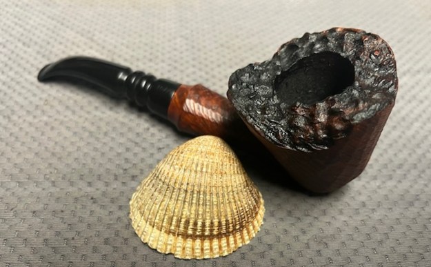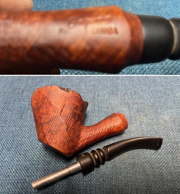 For those unfamiliar with this series, the Sportsman pipes were roughly shaped, semi-finished and sold each year at the Toronto Sportsman’s Show as rugged, rough-and-ready pipes suitable for bringing along to the cottage, hunt camp, fishing lodge or campground. The briar blocks were factory drilled, had the top half or so of the bowl machine-turned, and were fitted with a stem containing the Brigham filter system. The bottom half of the bowl and the shank were left roughly carved. Many of the Sportsman pipes were graded at a 3 Dot level, though I believe they were available in 3, 4 and 5 Dot grades.