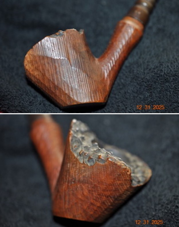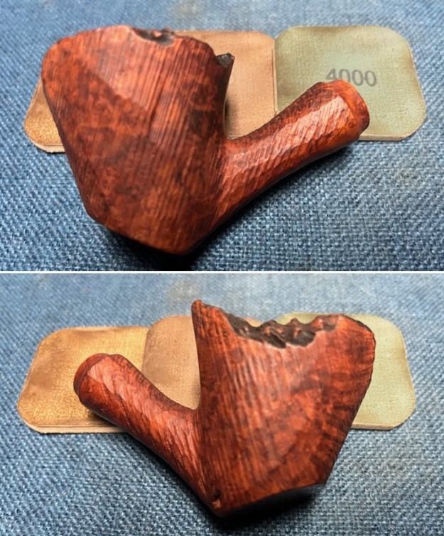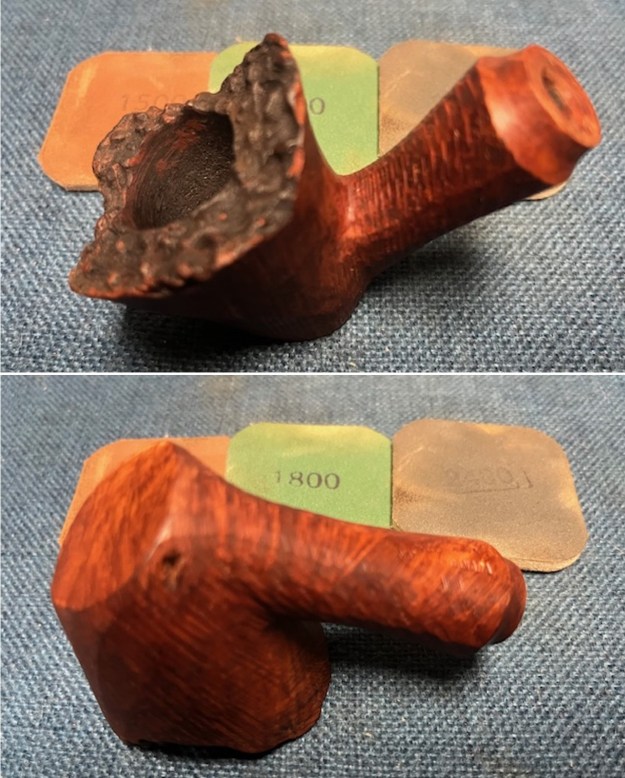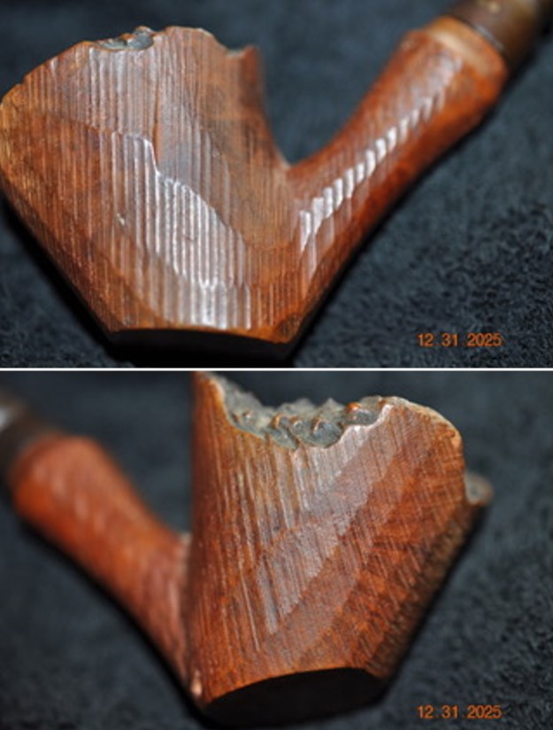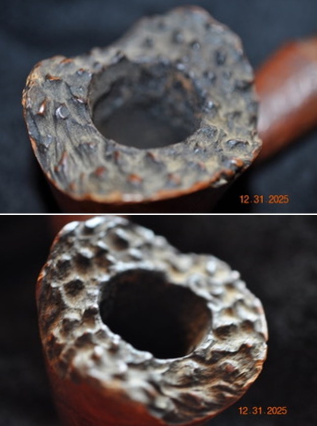 Jeff took close up photos so that I could have a clearer picture of the condition of the bowl, rim edges and top. The rim top photos confirm my assessment above. The cake in the bowl is thick – covering the walls of the bowl. The rim top has thick lava coat and has some darkening on the inner edge and is heavier toward the back of the bowl. The inner edge looks like it might be damaged. This is what I look for when assessing a pipe. I look forward to viewing it in person after the clean up work.