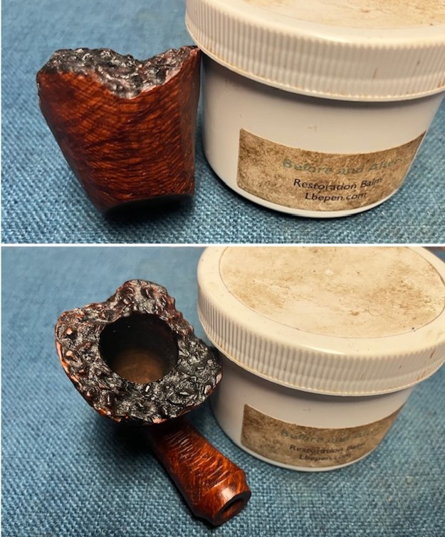I rubbed the bowl down with some Before & After Restoration Balm. I worked it into the briar with my fingertips and into the rugged rim top with a shoe brush. The product works to clean, renew and protect briar. I let it do its work for 15 minutes then buffed it off with a soft cloth. The pipe is really quite a beauty.