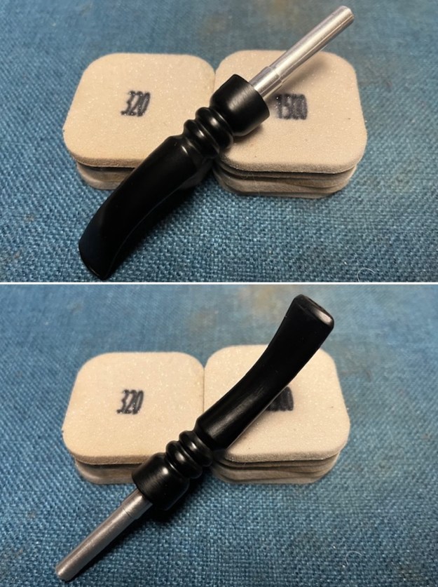 I set the bowl aside and turned my attention to the stem. I sanded out the light tooth marks and chatter on both sides with 32903599 grit 2×2 inch sanding pads and wiped it down between pads with an Obsidian Oil cloth. The shine really came alive.