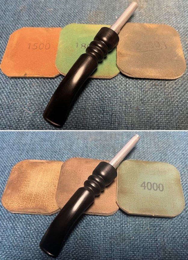 I polished out the surface of the stem ahead of the button on both sides using micromesh sanding pads. I dry sanded the stem with the 1500-12000 grit pads, then wiped it down with a cloth impregnated with Obsidian Oil. I finished polishing it with Before & After stem polish – both Fine and Extra Fine. I gave it a final coat of Obsidian Oil and set it aside to dry.