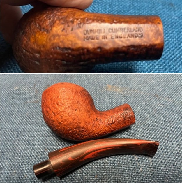 The next pipe on the table is one that we picked up in an estate we purchased from a seller in Durham, North Carolina, USA on 12/27/2025. The Sandblast finish and the Dunhill stamping caught our eye. It is stamped on the underside of the shank and reads 41083 on the heel of the bowl followed by Dunhill Cumberland [over] Made in England20. It has a classic Cumberland sandblast with a smooth rim top that is a stark contrast to Cumberland taper stem. The finish is a light sandblast and there is a lot of debris and dust in the nooks and crannies of the blast. The bowl appears to be moderately caked. The inner edge and the top show a lava overflow and darkening on the backside of the inner edge. The stem is oxidized, calcified and has deep tooth marks and chatter on the top and underside ahead of the button. Like the other pipes in this estate, the stem was chomped and spoke to the fact that it spent a lot time in the owner’s mouth. He loved this pipe and enjoyed it often. The classic white spot is on the left top side of the stem and looks to be in good condition. Jeff took some photos of the pipe to show the general condition of the pipe before he started his clean up.