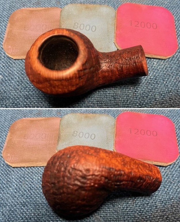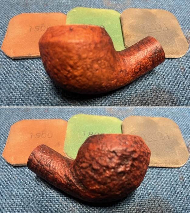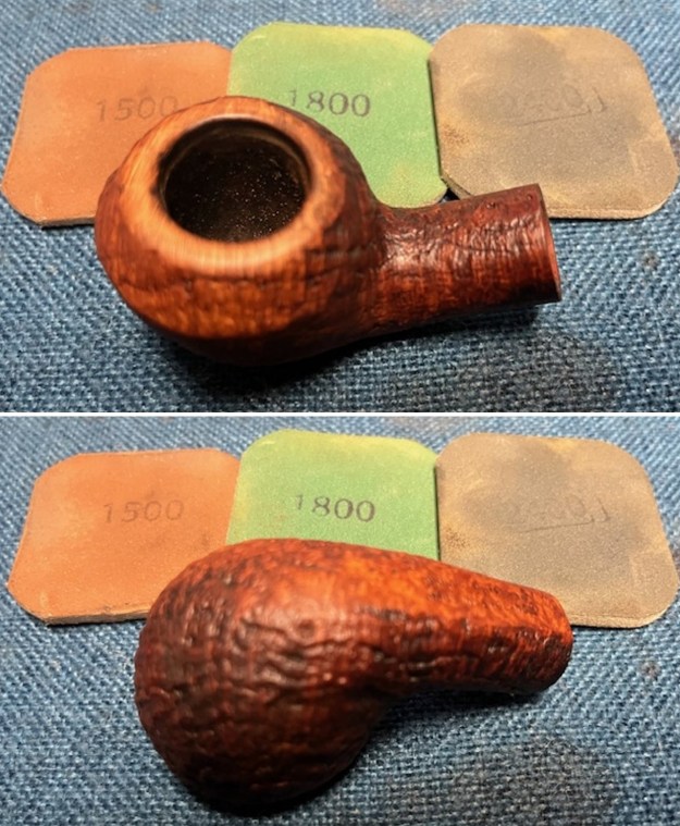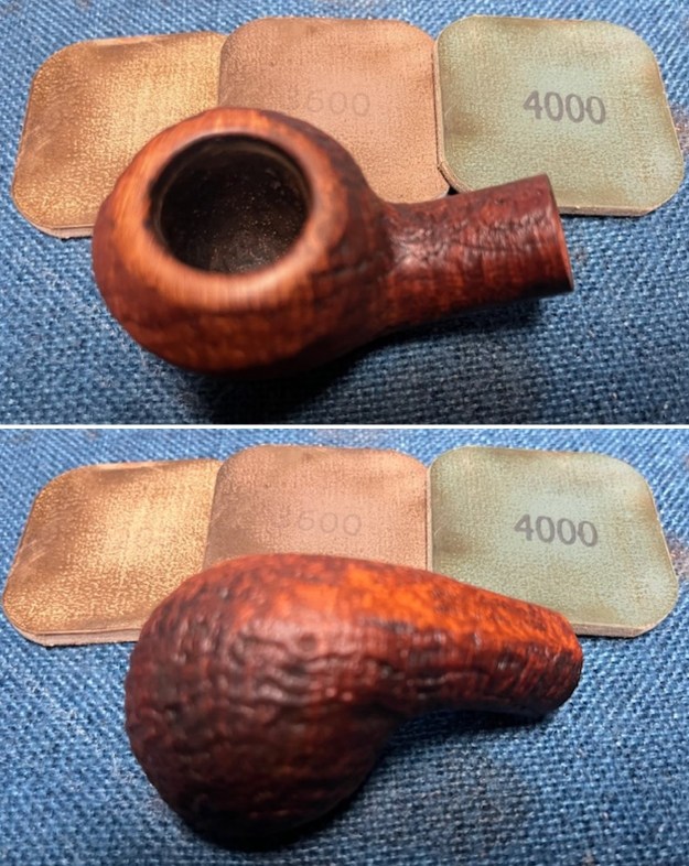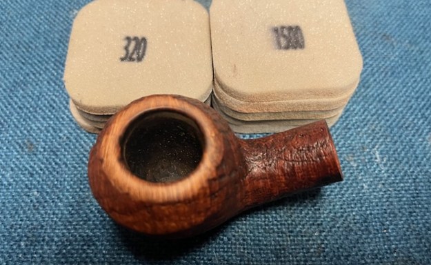 I started my work on the pipe by addressing the damage to the rim top. I used 320-3500 grit 2×2 inch sanding pads to smooth out the damage on the rim top and the inner edge. It looked much better once finished.
