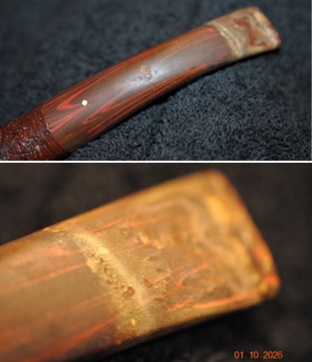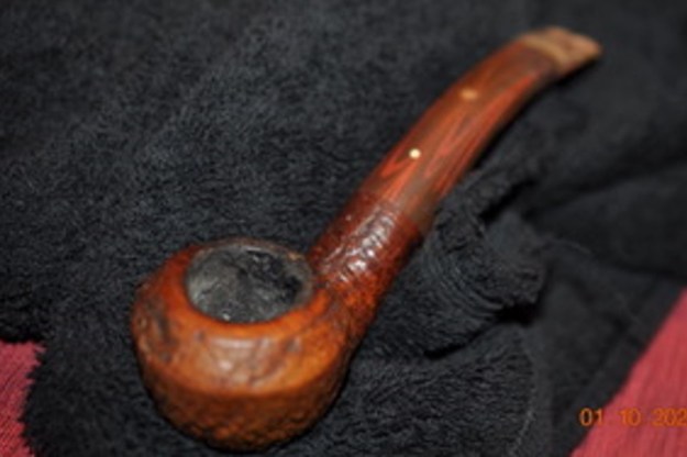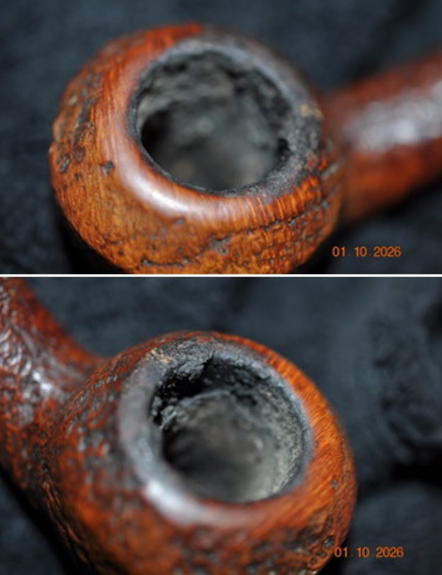 Armed with that information I turned to work on the pipe itself. Jeff had done a great job cleaning up the pipe as usual. He cleaned up the inside of the bowl with a PipNet reamer and a Savinelli Fitsall Pipe Knife. The rim top shows some damage on the top and the inner edge of the bowl. The bowl walls looked very good. He scrubbed the interior of the bowl and shank with pipe cleaners, cotton swabs and alcohol to remove the tars and oils. He scrubbed the exterior of the pipe with Murphy’s Oil Soap and a tooth brush to remove the grime from the finish. He worked on the rim top lava and darkening with the soap and tooth brush. He scrubbed the inside of the stem with alcohol and pipe cleaners. He scrubbed the exterior with Soft Scrub and then soaked it in Briarville’s Pipe Stem Deoxidizer. He washed it off with warm water to remove the deoxidizer. Now the damage to the stem was very clear. Overall, the pipe looked far better. I took photos of the pipe when I received it before I started working on it.