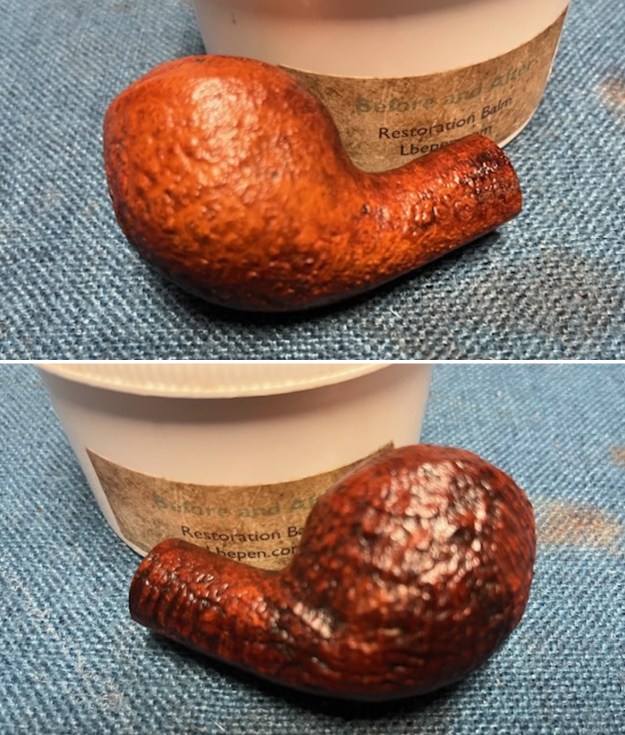 The exterior of the bowl look better after sanding. I worked some Before & After Restoration Balm into the briar with my finger tips. I let it sit on the bowl for 10 minutes and then buffed it off with a paper towel and soft cloth. The product is a great addition to the restoration work. It enlivens, enriches and protects the briar while giving it a deep glow. It is a product I use on every pipe I restore.