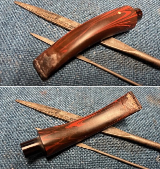 I sanded the Cumberland stem with 320-3500 grit sanding pads. The repairs began to disappear into the surface of the Cumberland and the stem began to take on a smooth new look. Progress for sure.