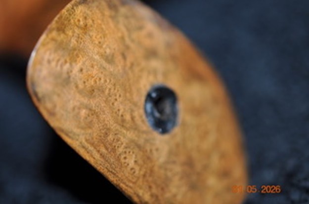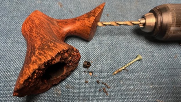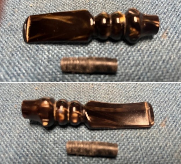 Now it was time to address the broken tenon in the shank. It was solidly stuck in place. I tried my usual tricks to pull it. Time in the freezer did nothing – still very tight and unmovable. I used an ear syringe to drop alcohol in he shank to see if it would loosened it – again nothing. I almost wonder if it was not glued in the shank.