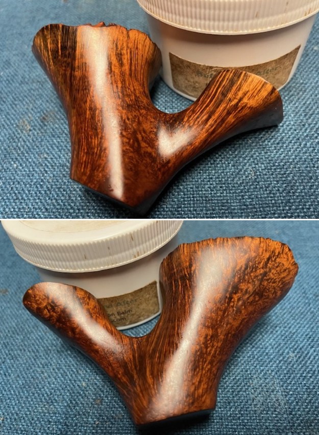 I rubbed the briar down with Before & After Restoration Balm. I worked it into the briar with my fingertips and a shoe brush. The product works to clean, enliven and preserve the briar. I let it sit for 10 minutes then I buffed it with a cotton cloth to deepen the shine. The briar comes alive with the balm.