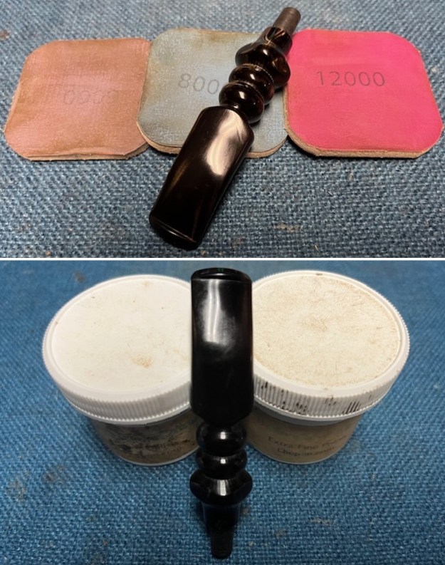 I polished the vulcanite with micromesh sanding pads – 1500-12000 grit pads. I wiped it down with Obsidian Oil after each sanding pad. I used Before & After Pipe Polish – both Fine and Extra Fine to further polish the stem. It really took on a shine and I knew that once it was buffed it would look amazing.
