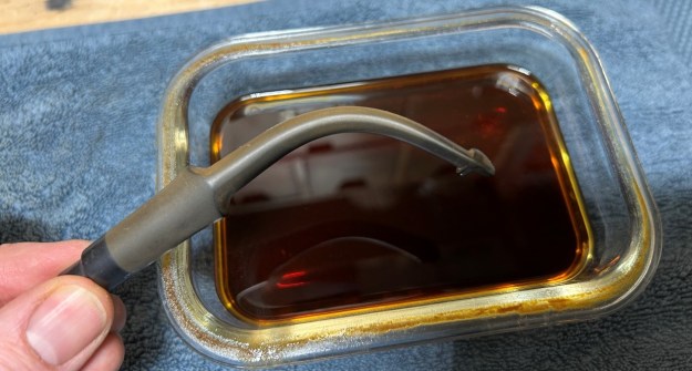 Once the stem was reasonably clean, I soaked it overnight in some Briarville Stem Oxidation Remover. This solution works to draw oxidation in the stem to the surface of the vulcanite. This is a major aid and an important step in ensuring a clean stem. The following day, I drew out the stem from its bath and scrubbed the lingering fluid with a toothbrush. Due to the severity of the oxidation, I then repeated the scrubbing with the cream cleanser for maximum effect.