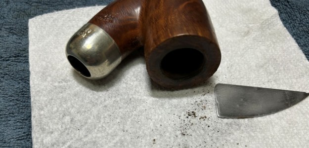 As the stem was (nearly) complete, I moved on to the stummel. The first step was to ream out the bowl – that is to say, remove all the cake inside the bowl. This accomplished a couple of things. First (and most obviously), it cleaned the bowl and provided a refurbished chamber for future smoking. Second, when the old cake was removed, I could inspect the interior walls of the bowl and determine if there was damage or not. I used a reamer, a pipe knife, and a piece of sandpaper taped to a wooden dowel. Collectively, these ensured that all the debris was removed.