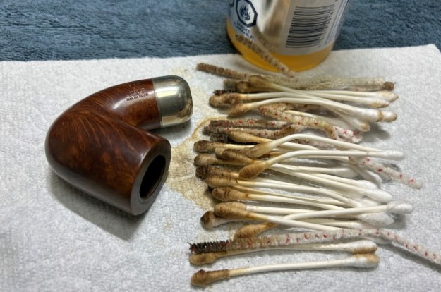 Similar to the stem, I then cleaned the stummel with both pipe cleaners and cotton swabs dipped in lemon-infused 99% isopropyl alcohol. With a pipe this dirty, it took quite a while and much cotton to clean.