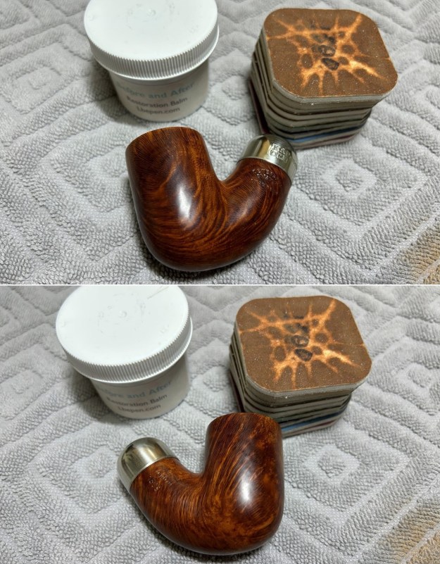 I rubbed some LBE Before & After Restoration Balm into the briar and let it sit for 30 minutes or so. The balm moisturizes the wood and gives a beautiful depth to the briar. I then buffed the stummel with a microfibre cloth.