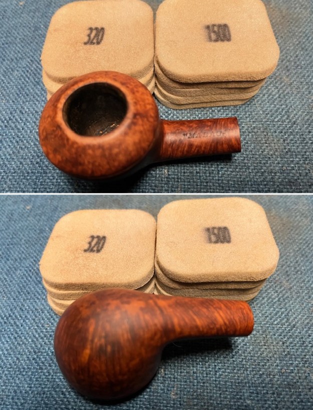 It was time to start my work on the pipe. I sanded the scratches and marks on the rim and bowl sides with 320-3500 grit 2×2 inch sanding pads. I wiped it down after each pad with a damp cloth. It really began to shine.