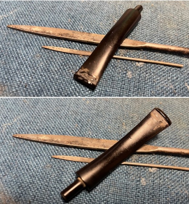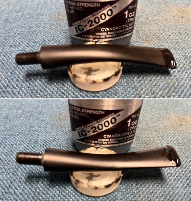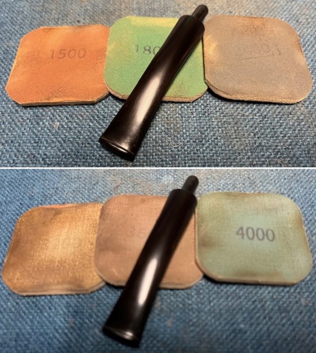 I sanded the stem with 2 x 2 inch sanding pads – dry sanding with 320-3500 grit pads and wiping it down after each pad with an Obsidian Oil cloth.