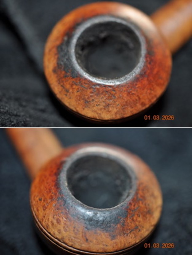 Jeff took photos of the rim and bowl to show the cake and a heavy lava coat on the crowned rim top and edges. The inner edge of the rim showed some darkening and had some cake on it. It was a dirty pipe but still a beauty. The hard rubber stem was lightly oxidized, calcified and had some deep tooth marks and some chatter on the top and underside of the stem.