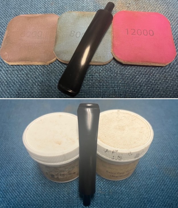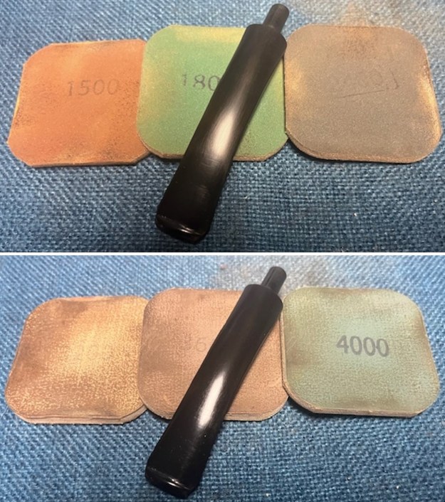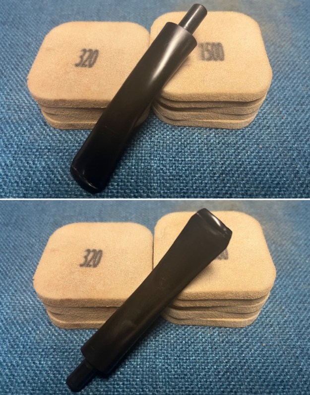I sanded the stem with 2 x 2 inch sanding pads – dry sanding with 320-3500 grit pads and wiping it down after each pad with an Obsidian Oil cloth.