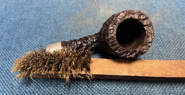 Jeff took photos of the bowl and rim top to show the thin cake in the bowl and the light lava build up on the rusticated rim top and the edges of the bowl. The rim top and edges looked good. Jeff took photos of the top and underside of the stem showing the tooth chatter on an otherwise good looking stem. More would be visible once Jeff cleaned it up.