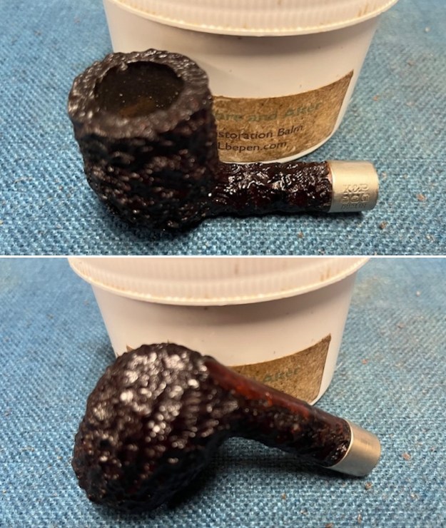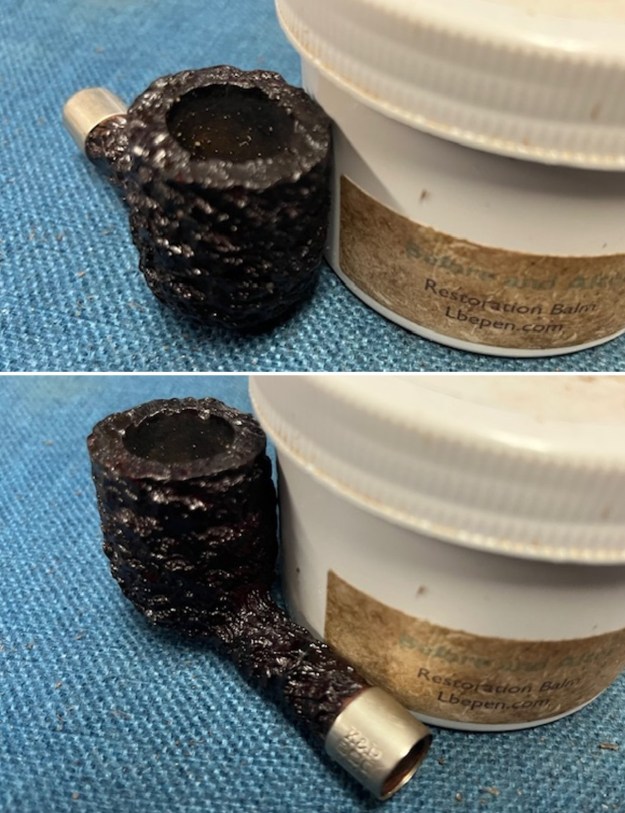 I worked some Before & After Restoration Balm into the surface of the briar with my fingertips and a horsehair shoe brush to clean, enliven and protect the briar. I let the balm sit for 10 minutes and then buffed with a cotton cloth to raise the shine. The photos show the bowl at this point in the restoration process.