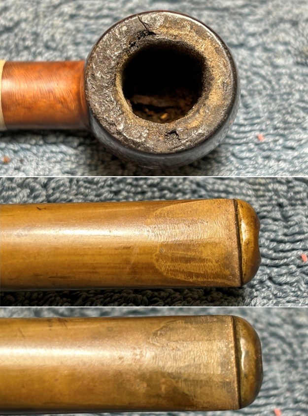 Loewe is one of the haunting old names of British pipe-making, characteristic of an almost vanished “upper middle class” of the trade, which also incorporated makes such as BBB, Orlik, Comoy’s and GBD. Along with these brands, Loewe has long dwindled into pseudo-existence, becoming little more than a logo occasionally used by the Cadogan factory in Southend-on-Sea. But owners of older Loewes treasure them as superb, featherweight smokers, excellently crafted and with grain characteristics superior to those of many contemporary Dunhills. The Frenchman Emil Loewe founded the company, both shop and workshop, in 1856 at the Haymarket 62, London. He is said to have been the first to make briar pipes in England. Richard Hacker maintains that theatre people from the West End were among the shop’s heyday aficionados. Loewe’s spigots are especially well regarded by lovers of elegance today – they were originally introduced for practical reasons, to facilitate the production of replacement stems for customers abroad.                  Furthermore, there is an excellent article on Loewe pipes (and especially their dating) by Martin Farrent, which Steve reposted on this blog. You can read it here. It would appear that much of his article was used to make the Pipedia post. In any case, it is well worth reading.Let’s examine this marvellous pipe. The condition of the pipe is not ideal, but only in the same sense that a hero wounded in battle is not ideal. The stem is beautifully shaped, but heavily oxidized. There are some scratches on the stem, around the bit, suggesting that someone may have tried to sand down some ancient tooth marks. This is an orific stem – not surprising, given its age – and it’s worth reading Steve’s old blog about such stems here. Meanwhile, the stummel has some issues. There is plenty of cake in the bowl, a mound of lava on the rim, a few small nicks here-and-there, and – most notably – a crack in the bowl and a crack in the shank. Finally, the sterling silver band is heavily worn and thoroughly tarnished.Before I go on, I want to make something clear: because of the age of the pipe, I will not be making some of the repairs that I might on a younger pipe. There is something special about this Loewe – and its wounds are part of its history, part of its story.
