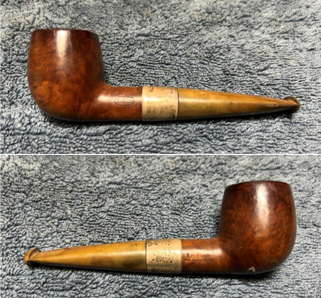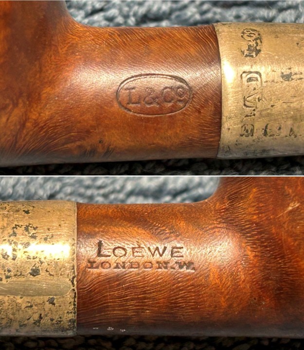 Loewe is one of the haunting old names of British pipe-making, characteristic of an almost vanished “upper middle class” of the trade, which also incorporated makes such as BBB, Orlik, Comoy’s and GBD. Along with these brands, Loewe has long dwindled into pseudo-existence, becoming little more than a logo occasionally used by the Cadogan factory in Southend-on-Sea. But owners of older Loewes treasure them as superb, featherweight smokers, excellently crafted and with grain characteristics superior to those of many contemporary Dunhills. The Frenchman Emil Loewe founded the company, both shop and workshop, in 1856 at the Haymarket 62, London. He is said to have been the first to make briar pipes in England. Richard Hacker maintains that theatre people from the West End were among the shop’s heyday aficionados. Loewe’s spigots are especially well regarded by lovers of elegance today – they were originally introduced for practical reasons, to facilitate the production of replacement stems for customers abroad.                  Furthermore, there is an excellent article on Loewe pipes (and especially their dating) by Martin Farrent, which Steve reposted on this blog. You can read it here. It would appear that much of his article was used to make the Pipedia post. In any case, it is well worth reading.Let’s examine this marvellous pipe. The condition of the pipe is not ideal, but only in the same sense that a hero wounded in battle is not ideal. The stem is beautifully shaped, but heavily oxidized. There are some scratches on the stem, around the bit, suggesting that someone may have tried to sand down some ancient tooth marks. This is an orific stem – not surprising, given its age – and it’s worth reading Steve’s old blog about such stems here. Meanwhile, the stummel has some issues. There is plenty of cake in the bowl, a mound of lava on the rim, a few small nicks here-and-there, and – most notably – a crack in the bowl and a crack in the shank. Finally, the sterling silver band is heavily worn and thoroughly tarnished.Before I go on, I want to make something clear: because of the age of the pipe, I will not be making some of the repairs that I might on a younger pipe. There is something special about this Loewe – and its wounds are part of its history, part of its story.
